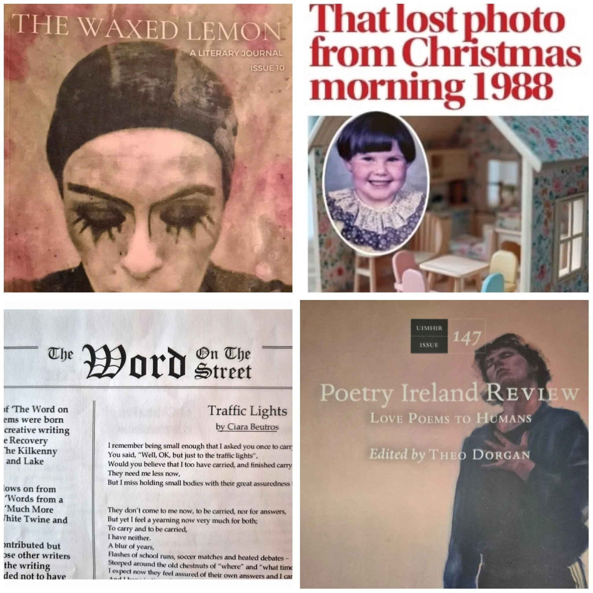 The year ended with poems published in The Waxed Lemon - Issue 10, The Word of the Street, The Kilkenny Observer and Poetry Ireland Review - 147. You can read more at the link below or under the “Published Work” tab above.